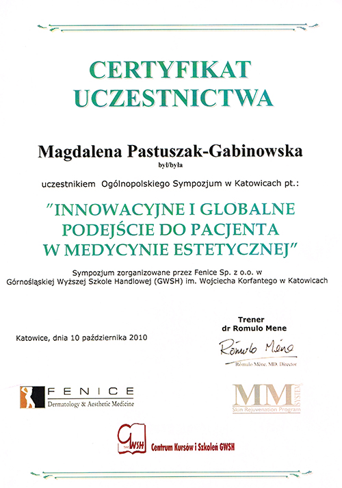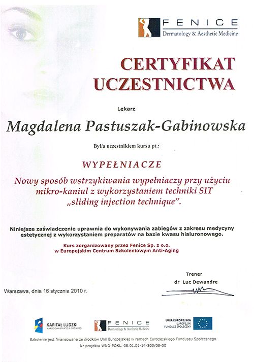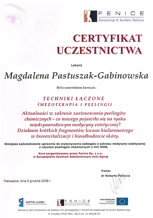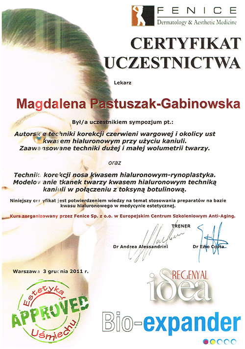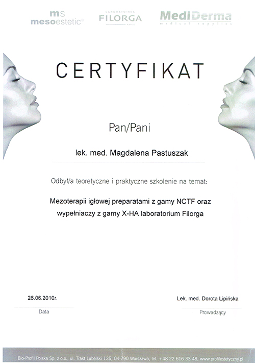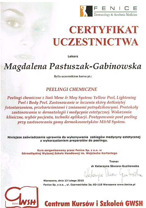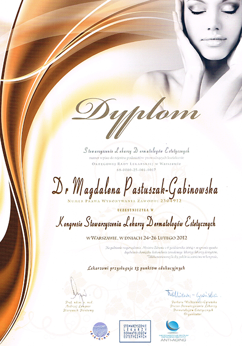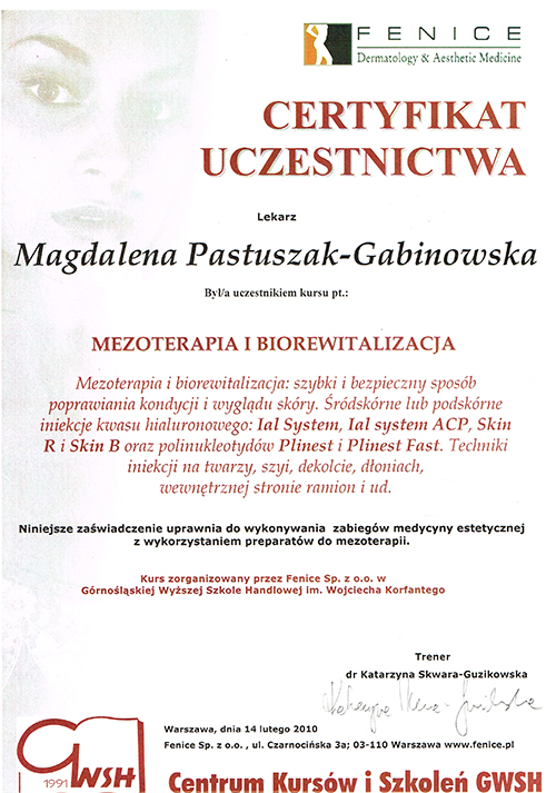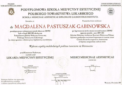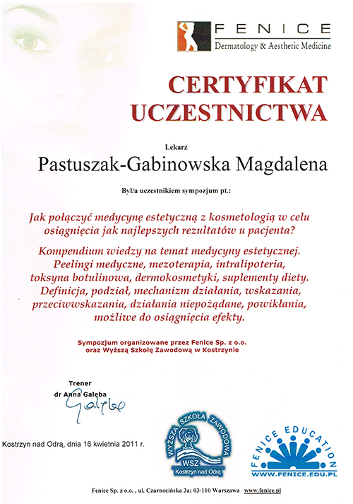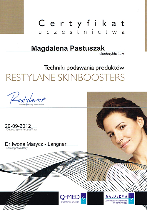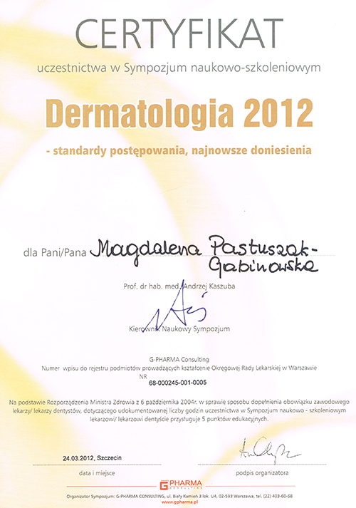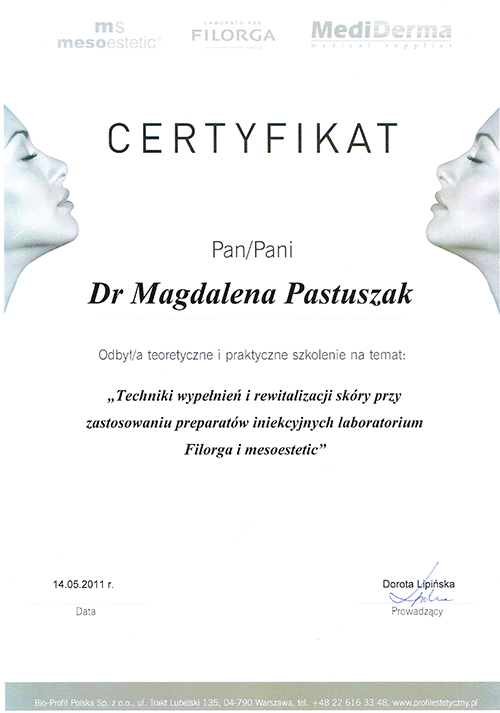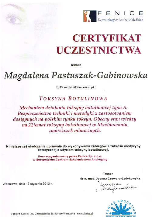 Dr Magdalena Pastuszak – lekarz specjalista w dziedzinie dermatologii, certyfikowany lekarz medycyny estetycznej, absolwentka Pomorskiej Akademii Medycznej w Szczecinie oraz Podyplomowej Szkoły Medycyny Estetycznej PTL w Warszawie. Pracownik Kliniki Chorób Skórnych i Wenerycznych w Szczecinie. Członkini Polskiego Towarzystwa Medycyny Estetycznej i Anti-Aging. Jako jedna z pierwszych w Polsce uzyskała certyfikat lekarza medycyny estetycznej, przyznawany przez Polskie Towarzystwo Medycyny Estetycznej i Anti-Aging, potwierdzający wysokie kwalifikacje lekarza wykonującego zabiegi z zakresu medycyny estetycznej. Autorka oraz współautorka licznych artykułów w czasopismach krajowych i zagranicznych.
